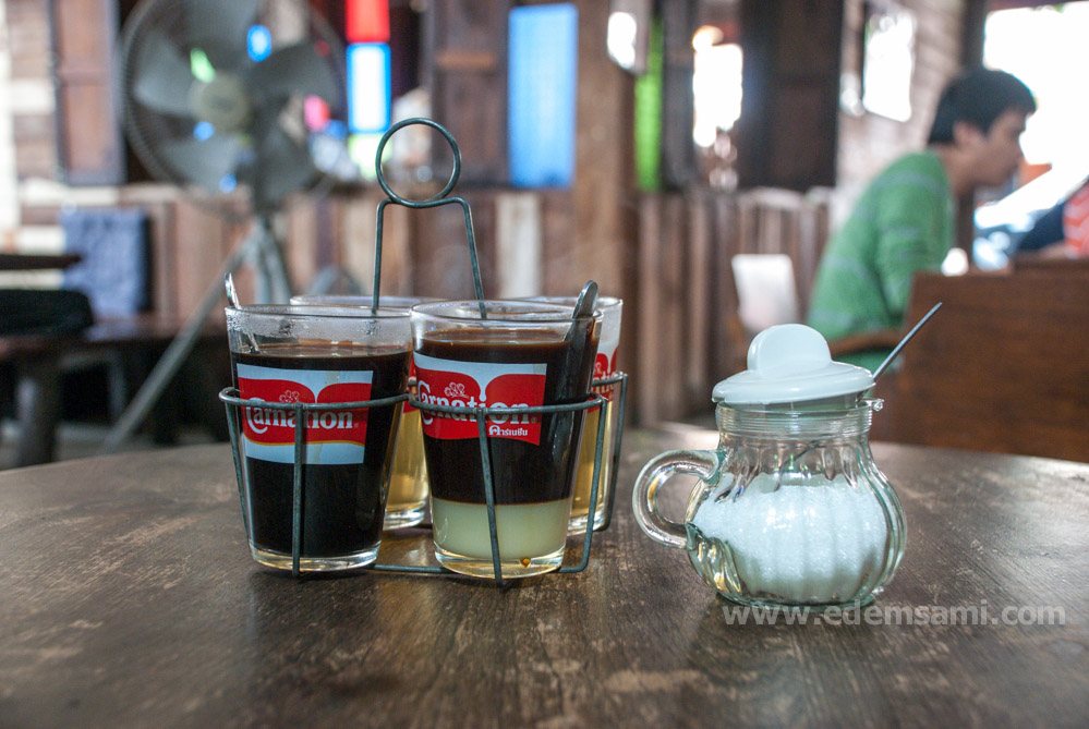 Простенькая кофейня дверь-в-дверь с кухней матушки Тэ. После наваристого супчика поутру кофе идет как нельзя лучше. Гафе боран – это сваренный кофе со сгущенным молоком. Сладко, но бодряще. Два стакана обошлись нам в 30 батов оба. Обстановка чарующая, Wi-Fi бесплатный.