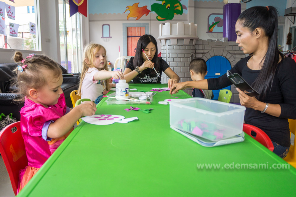 Заведует комнатой кхун Са, которая также проводит по четвергам небольшие двухчасовые мастерские с 10.00 до 12.00, во время которых мамы с детьми сначала мастерят какую-то несложную мелочь, а остальное время все счастливо занимаются своими делами с небольшим перекусом (рис с курицей, либо фрукты с печеньями, либо что-то еще подобного рода). Стоимость 200 батов за все.