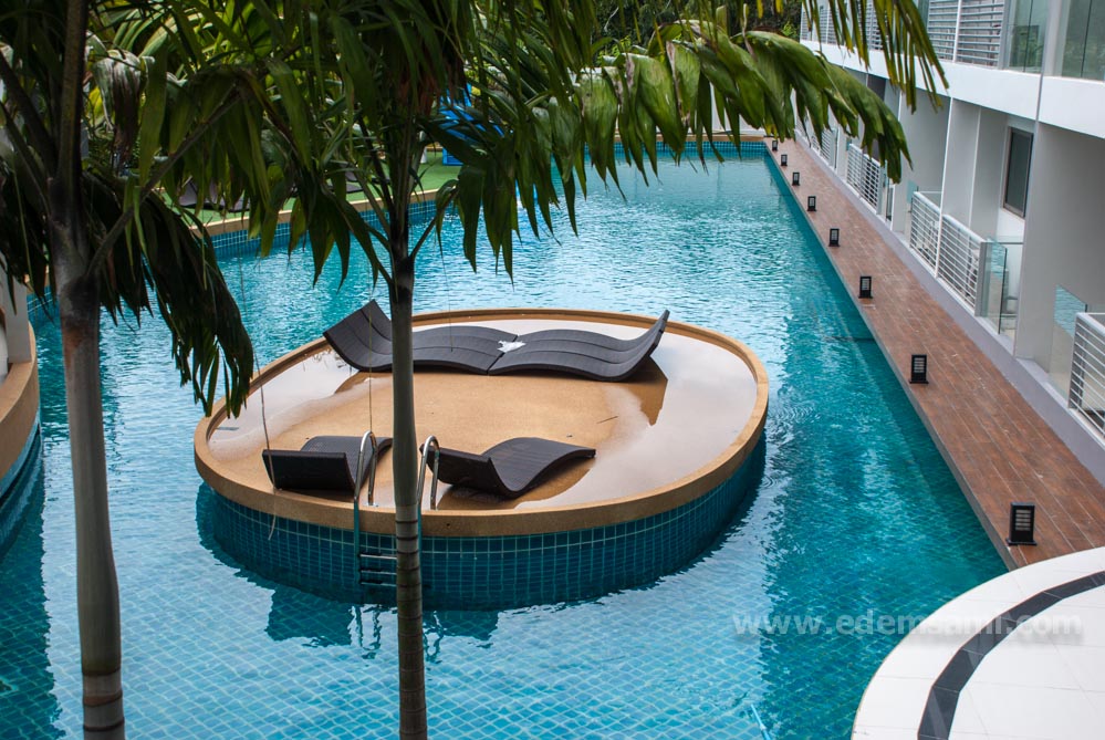 Как и в Атлантисе, некоторые квартиры первого этажа выходят прямо на бассейн. Не в бассейн, а именно на бассейн, т.к. присутствует небольшой деревянный настил. Но этот плюс несколько нивелируется тем, что у балконов забыли (?) сделать хотя бы какое-то подобие дверцы.